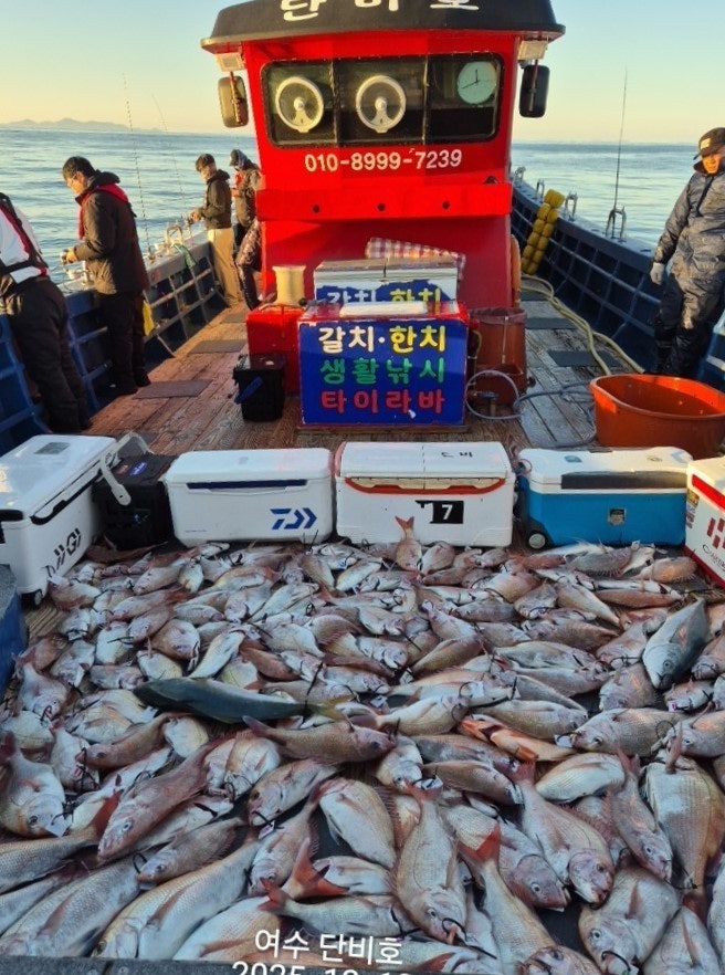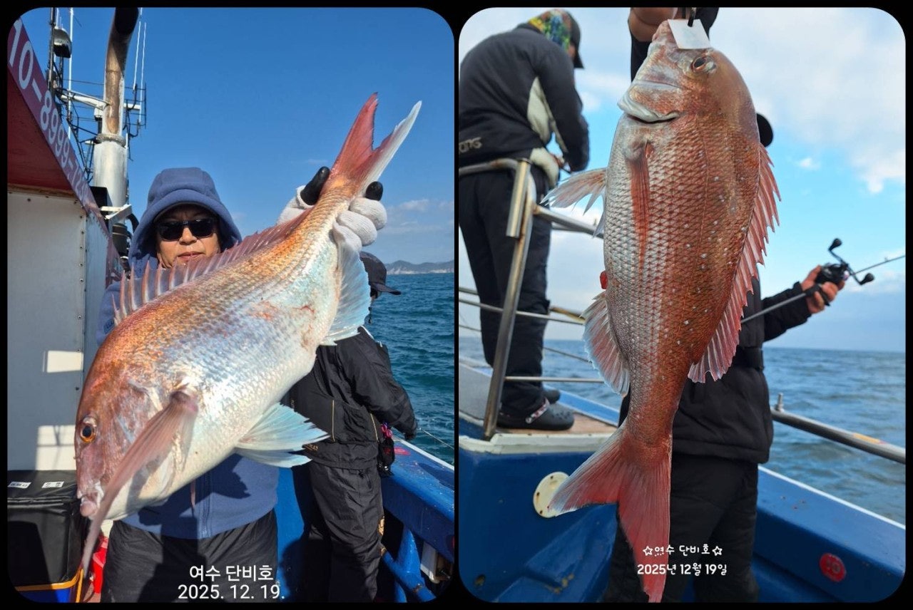 #출조시간변경▶오전3시30분출조~오후4시현장철수#현재ㅡ거문도권입니다ㅡ9.77톤ㅡ17석#12월30일(화)ㅡ5자리여유#선실자리지정석 #미끼제공 #얼음제공#한강라면기기 #캡슐원두커피 #단비편의점<스넥바>ㅡ 25년 12월28일(일) 참돔타이라바 조황 ㅡ거문도권에서 5짜,4짜급으로 열심히 참돔 타작하고 돌아왔습니다역시나 터지고, 빠지고에 연속 ^^오전,오후 대물급 입질을 받았지만 채비터짐으로맨탈이 털린 조사님도 계시네요출조전 채비정비 꼭 해주시고요초보조사님들은 선장님, 사무장님께 말씀해주셔야개인레슨 해드립니다오늘도 모두모두 고생많으셨습니다 ^^출조시간 변경되었습니다● 오전 3시 30분 출조● 오후 4시 현장철수 (7시쯤 항 도착)2026년 1월 1일 (목요일)은 먼바다 기상악화로내만권으로 참돔출조합니다내만에도 대물들이 출몰하오니 참돔 손맛보실분들단비와 선상에서 떡꾹드시며 해돋이 보실분들마구마구 예약해주세요◆ 30이하는 무조건방생입니다 ◆#12월30일(화)ㅡ5자리여유#1월1일(목)ㅡ8자리여유(내만권)#1월2일(금)ㅡ자리여유#1월3일(토)ㅡ5자리여유#1월4일(일)ㅡ자리여유#1월5일(월)ㅡ자리여유#1월6일(화)ㅡ자리여유#12월28일(일)ㅡ자리여유 ☎ 예약문의 : 010-8999-7239 홈페이지 예약 아래클릭 ▼▼▼▼▼▼▼▼▼▼▼▼▼▼http://danbi.sunsang24.com/★ 오시는 길여수시 신월동 금성휴먼터치빌 APT 101동101동 밑 바닷가 빨간색배 "단비호" 를찾아주세요★ 꼭 지켜주세요● 음주 금지 (술 반입금지)● 구명조끼는 하선하실때까지 착용하세요● 선내 절대 금연, 음식물 섭취불가● 예약은예약싸이트(선상24)나전화나 문자로 부탁드립니다. (톡,밴드댓글 X)● 예약은 무조건 선비입금자 우선입니다.● 대여는 예약시 미리 말씀해주셔야합니다.● 단비호는 출조점을 받고있지않습니다.버스만을 이용하시는분들은 연계해드릴수있습니다.(출조버스와 통화후 예약부탁드립니다)※ 에이스 출조버스 010-3236-2329(거문도, 백도, 여서도권) 준비는요렇게~* 합사 ㅡ 0.8 ~1호 (200m 이상)* 쇼크리더 ㅡ 3호~5호* 헤드 ㅡ 100~200g (수심 50~90m권)* 스커트 ㅡ 색상다양하게◆ 시 간출 항 : 오전 3시 30분 출항철 수 : 무조건 현장서 오후 4시에 철수※ 출조전 안내문자 보내드리고있습니다.※ 안내해드린 시간에 뽑기 진행합니다늦게오시면 남은 자리에 앉을수있음을 공지합니다.◆ 입금 계좌수협 0010-8999-7239 (김경화)선비입금이 확인되어야 예약확정입니다(예약자와 입금자가 다를경우 문자부탁드립니다)◆ 선사 제공청개비 (주문하신분에 한하여), 얼음모닝 떡만두국, 중식(뷔페식), 오후 꼬지오뎅한강라면 , 생수, 음료, 군것질과자. .※ 어창 ㅡ 해수 순환 & 브로와 설치로 입항시까지생선을 살려올수있어요◆ 선사 대여※ 예약시 미리 말씀해주세요● 베이트릴= 1만원● 전동릴= 1만원● 로드 = 1만원※ 분실 & 파손시 배상비를 받고있습니다.※ 합사 손실이 많을시 합사가격을 받고있습니다◆ 자리 배정선상에서 뽑기 진행합니다1) 예약자중 대표1분이 뽑기진행2) 1번 뽑으신분부터 원하시는자리로3) 일행 ㅡ 일렬배정입니다4) 우선배정 순위① 최우선 ㅡ 이틀자(일렬배정)② 우선 ㅡ 단체(4인부터) 일렬배정#참돔타이라바전문선사★★단비호★★#한강라면기기 #캡슐원두커피 #단비편의점<스넥바>#선실자리지정석 #얼음제공*** 여수 단비호 예약 안내 ***예약문의 : 010-8999-7239오시는길 : 전라남도 여수시 신월5길 22 (금성휴먼터치빌아파트 101동 밑 바닷가)홈페이지 : http://danbi.sunsang24.com/